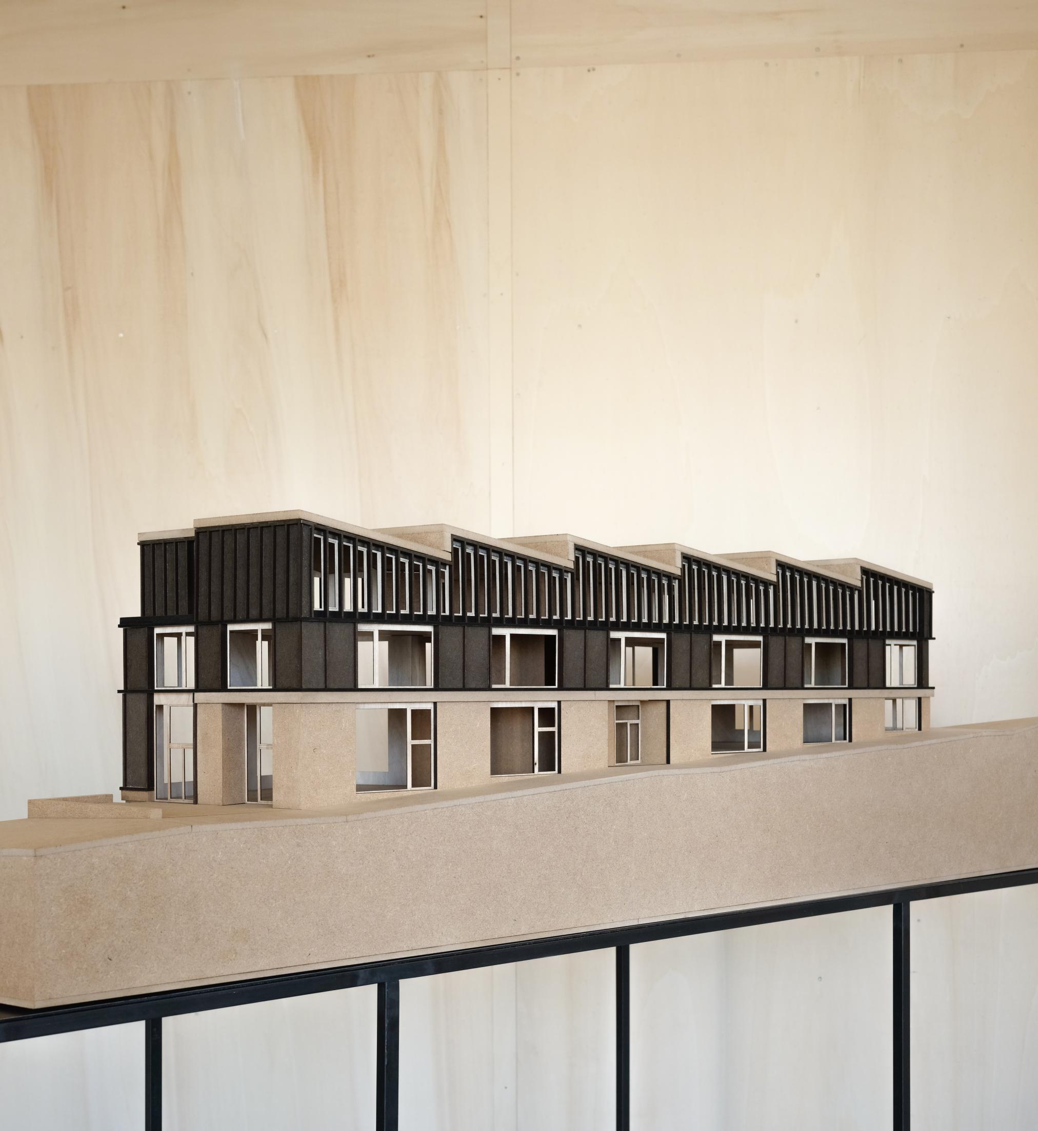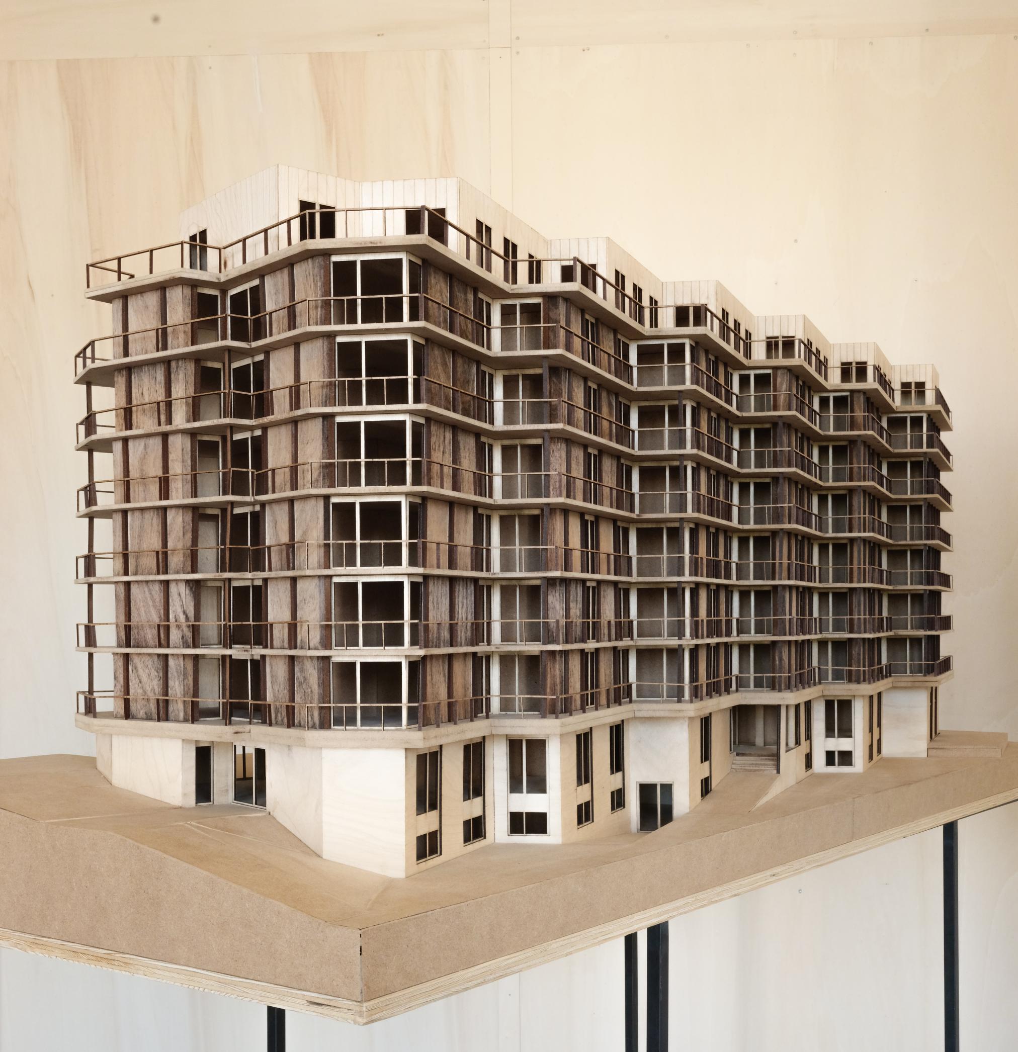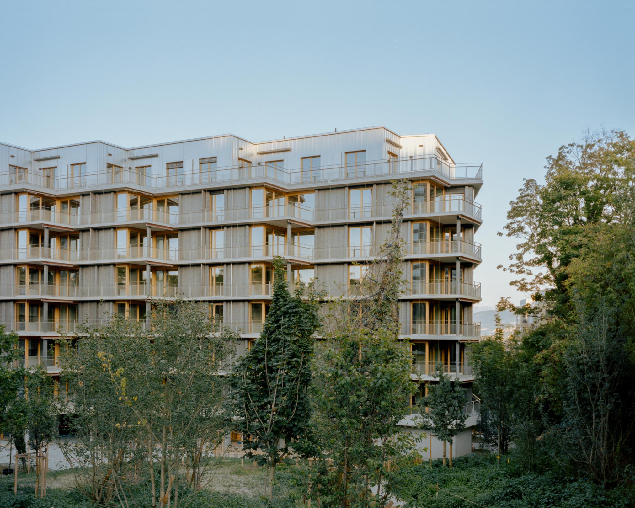 Pour le bâtiment le plus élevé, chaque module d’appartement a été pivoté, par un geste géométrique fort, sur son axe, afin de se détourner des vis-à-vis directs, éviter les nuisances sonores de la route voisine et profiter d’une orientation sud et ouest.