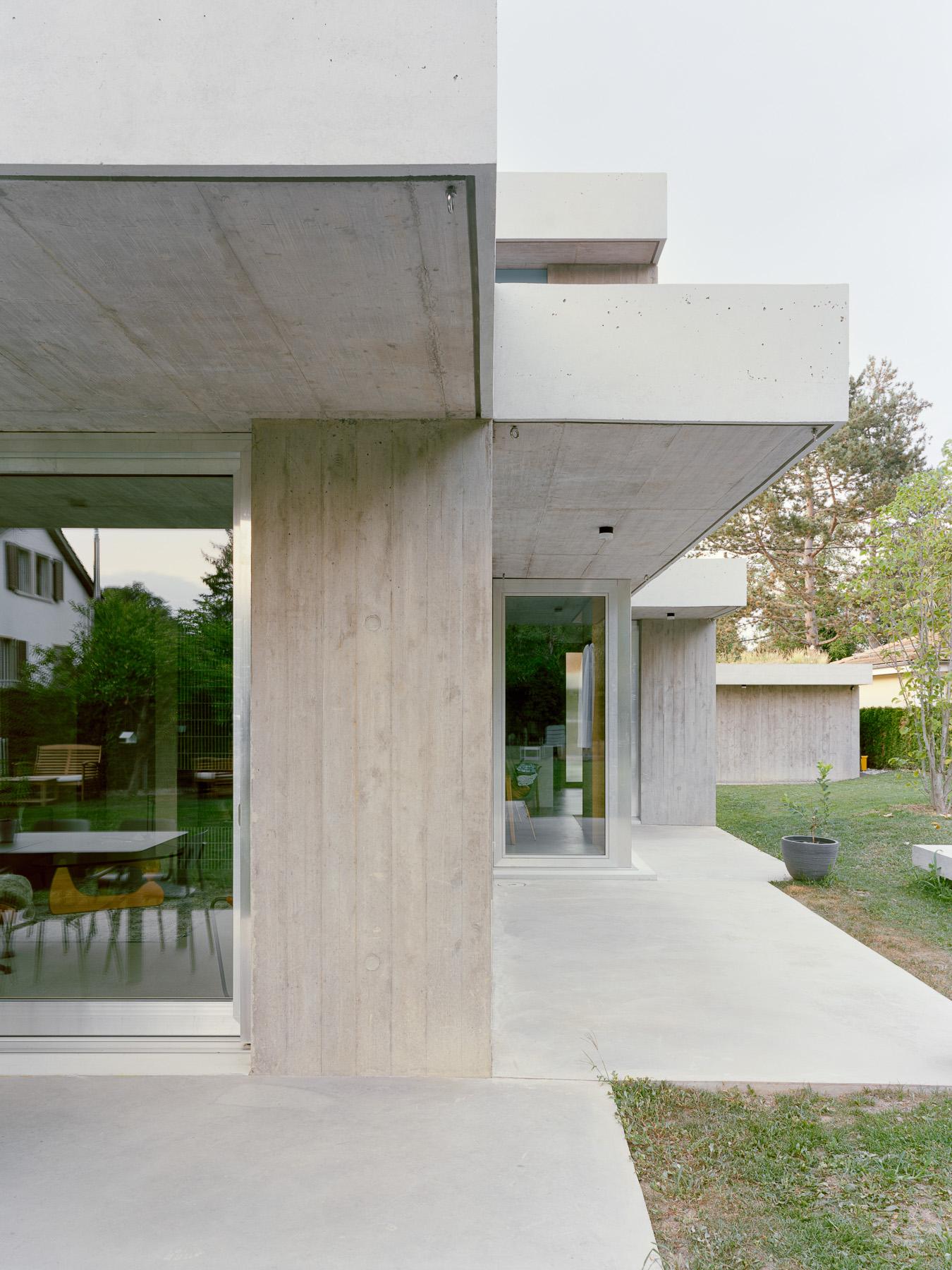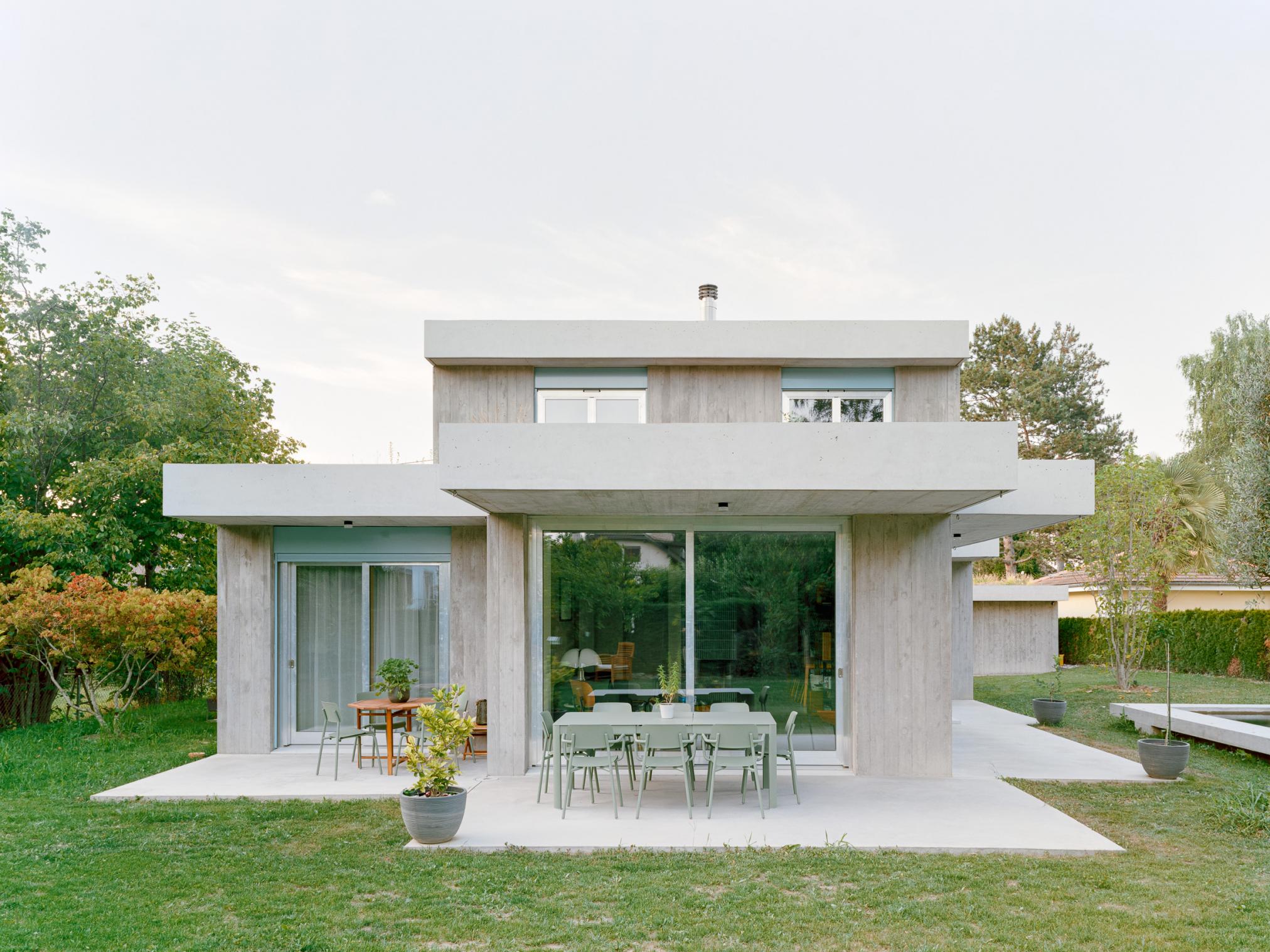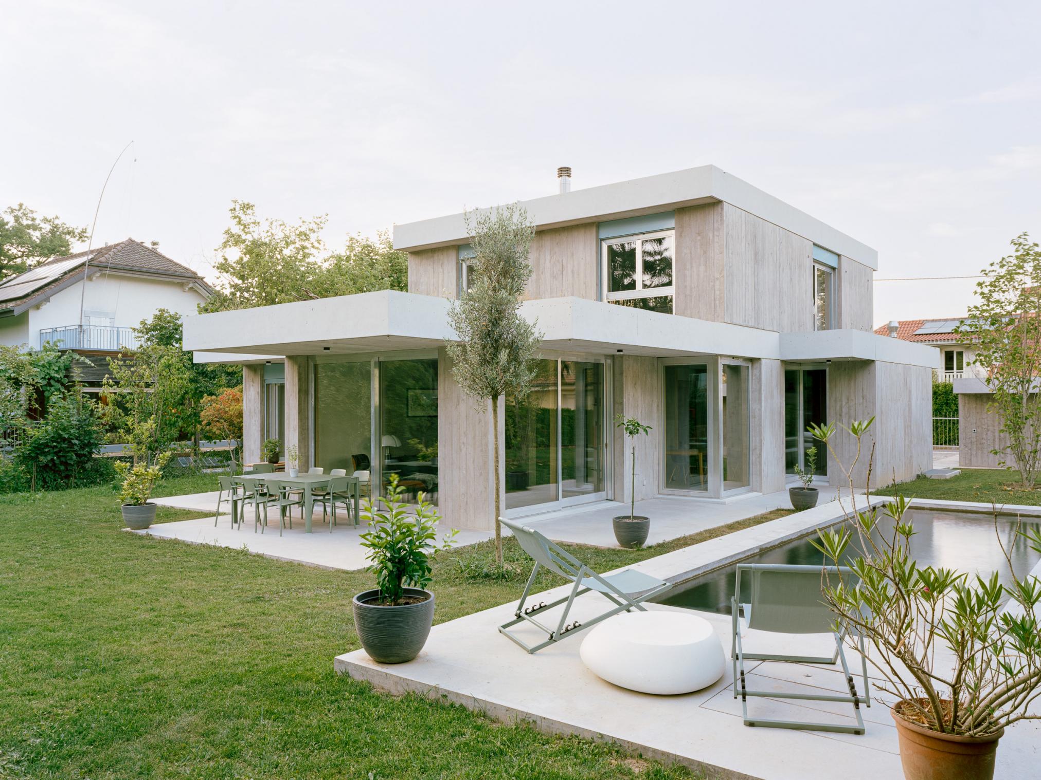 Le projet met en avant la noblesse des matériaux bruts, en particulier le béton, qui est délibérément laissé apparant pour valoriser son esthétique et sa texture. La villa a été isolée par l’intérieur, garantissant confort thermique et acoustique. Les murs extérieurs présentent un coffrage réalisé avec de véritables lames de bois, créant un jeu visuel unique en contraste avec le bandeau en béton lisse, symbole d’une architecture contemporaine alliant chaleur et sobriété.