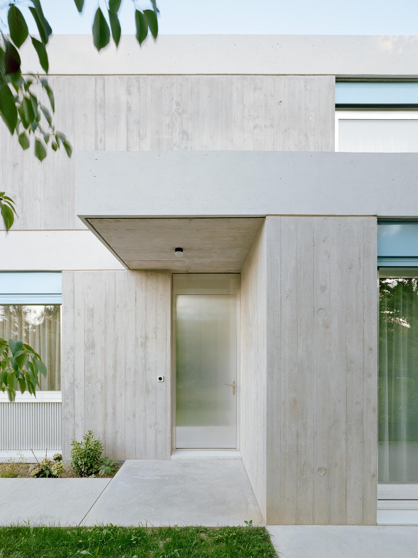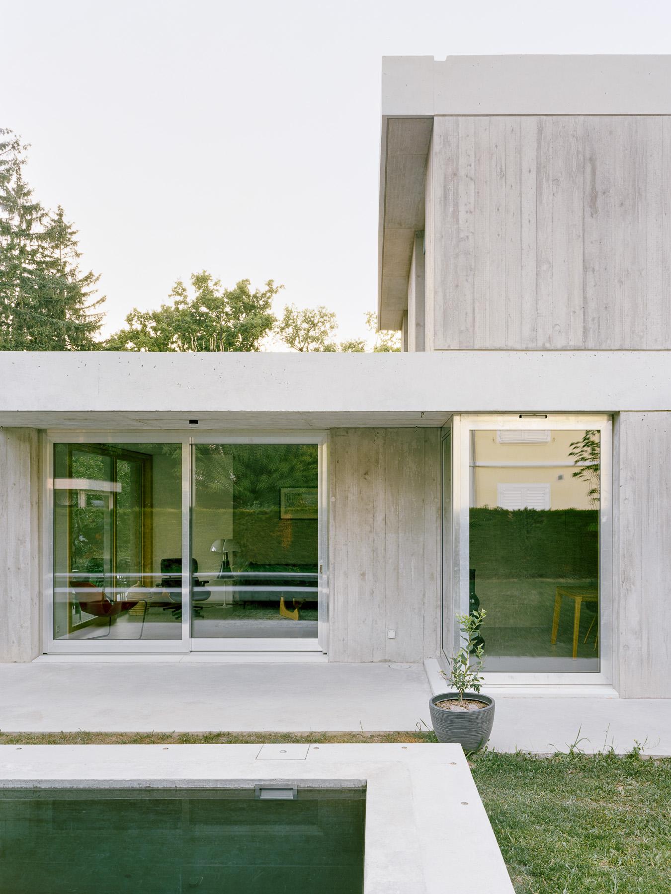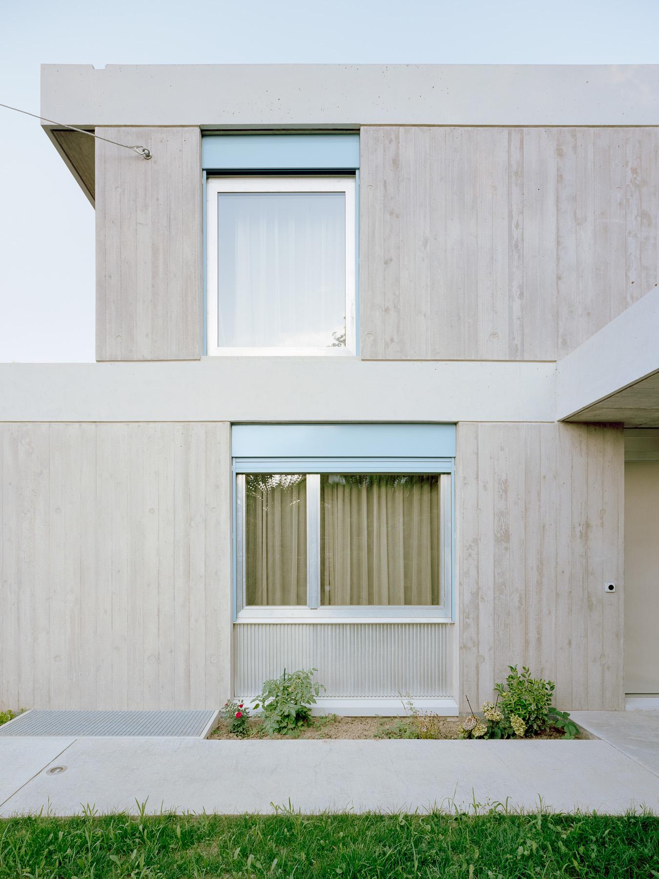 Le projet met en avant la noblesse des matériaux bruts, en particulier le béton, qui est délibérément laissé apparant pour valoriser son esthétique et sa texture. La villa a été isolée par l’intérieur, garantissant confort thermique et acoustique. Les murs extérieurs présentent un coffrage réalisé avec de véritables lames de bois, créant un jeu visuel unique en contraste avec le bandeau en béton lisse, symbole d’une architecture contemporaine alliant chaleur et sobriété.